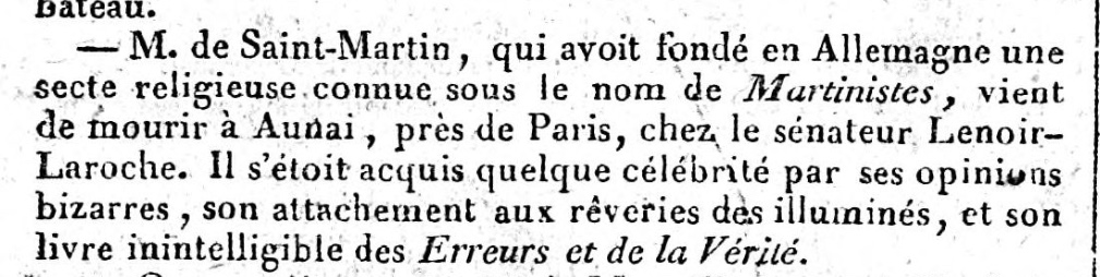 The text below was published in the broadsheet 'Journal des débats' on November 6, 1803. "M. de Saint-Martin, who had founded in Germany a religious sect known as the Martinists, has just died at Aunay, near Paris, at the home of Senator Lenoir-Laroche. He had acquired some celebrity for his bizarre opinions, his attachment to …